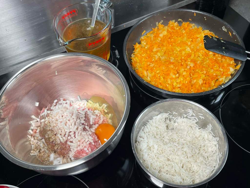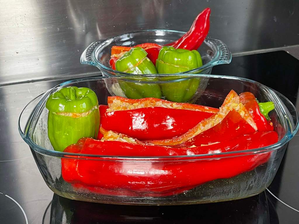 Baltus (basmati) ryžius virti pasūdytame vandenyje ne ilgiau kaip 5 minutes. Ryžiai neturi būti visiškai išvirę. Nusausinti ir atidėti. Svogūnus ir česnakus nulupti ir smulkiai sukapoti. Morkas nuplauti, nulupti ir sutarkuoti. ½ sultinio kubelio ištirpinti 400 ml karšto vandens. Keptuvėje ant vidutinės ugnies įkaitinti alyvuogių aliejų ir pakepinti svogūnus, česnakus bei tarkuotas morkas, kol lengvai suminkštės ir pasklis aromatas. Į dubenį sudėti maltą mėsą, ryžius, kiaušinį ir prieskonius. Sudėti apkepintus svogūnus, česnakus ir morkas. Į faršą supilti apie 200 ml jautienos sultinio. Gerai išmaišyti, minkant rankomis, kad visi ingredientai tolygiai susijungtų. Orkaitę įkaitinti iki 180°C. Paprikas nuplauti, nupjauti „kepurėles“ ir atsargiai išskobti vidų, nepažeidžiant sienelių. Paprikas pripildyti faršu, jų išorę lengvai patepti alyvuogių aliejumi ir sudėti į lengvai aliejumi pateptą kepimo indą. Kad kepant išliktų drėgmė, į kepimo indą supilti likusį jautienos sultinį. Kepti orkaitėje, atvirame inde, apie 50 minučių.