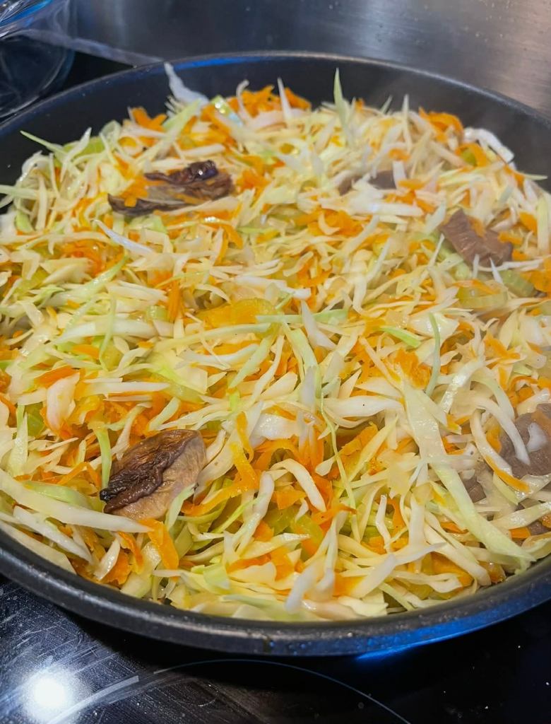 - Į keptuvę pilti aliejaus ir įkaitinti. Berti pjaustytus svogūnus ir pakepinti iki skaidrumo. Prie jų suberti salierus, morkas, išmirkytus grybus ir dar pakepti apie 5 min. Prie apkepusių daržovių dėti pjaustytus šviežius kopūstus ir vėl pakepti.