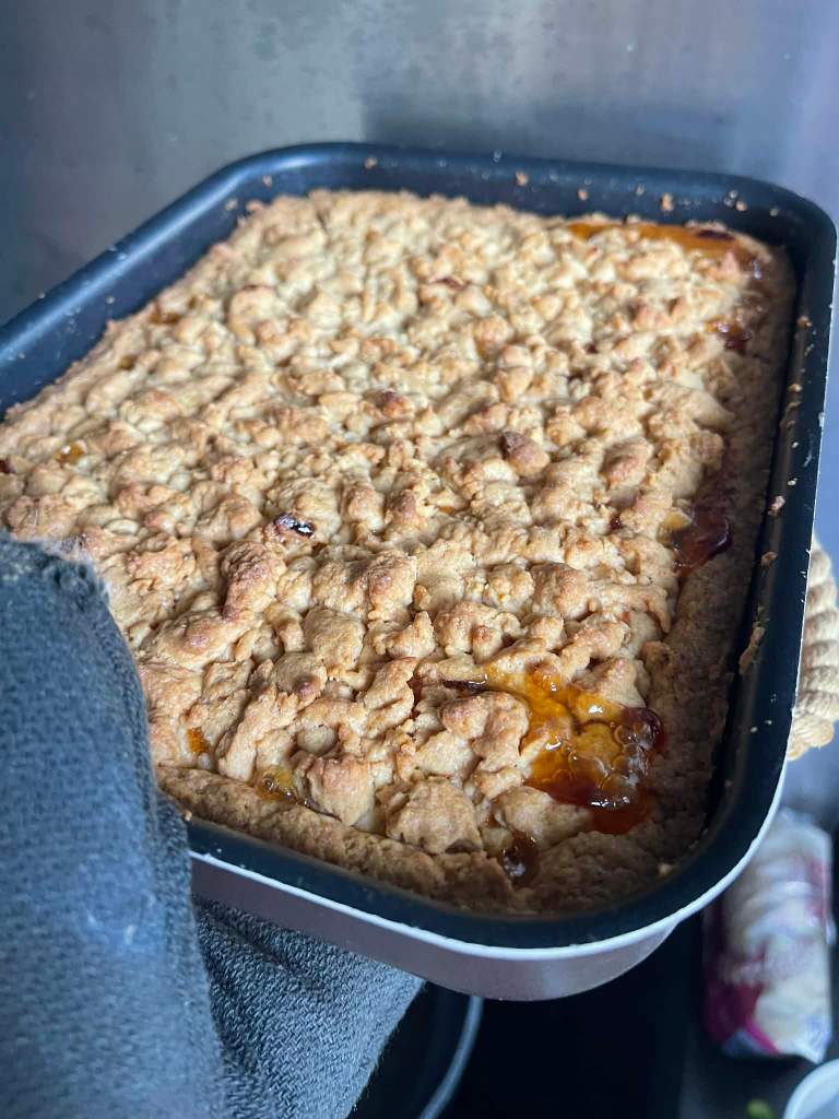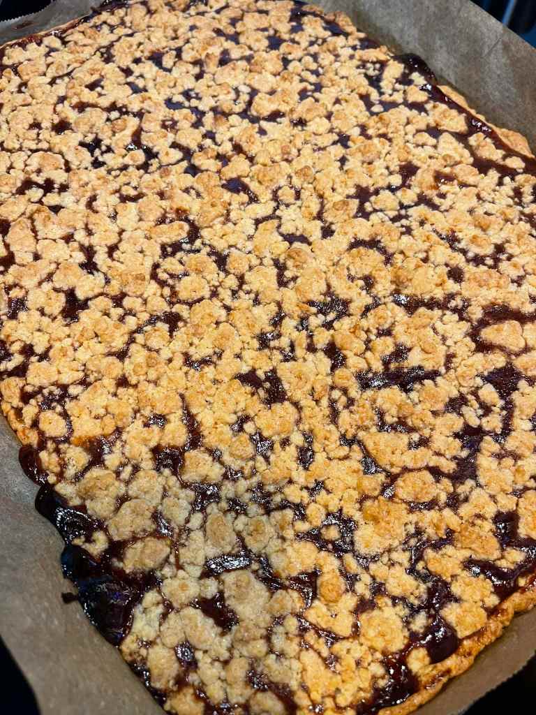 Švelniai išplakti kiaušinį. Miltus persijoti su kepimo milteliais. Į dubenį suberti miltus, kepimo miltelius, cukrų ir druską. Supilti plaktą kiaušinį ir sudėti gabalėliais pjaustytą arba tarkuotą šaltą (būtinai!) sviestą ir graikišką jogurtą. Visą mišinį trinti pirštais (ne delnais), kol susiformuos stambūs trupiniai. Kepimo indą (20×30 cm) iškloti kepimo popieriumi. Du trečdalius tešlos (apie 620 g) iškočioti ir iškloti kepimo indo dugną, suformuojant pagrindą ir bortelius. Kepimo indą su tešla dėti į šaldytuvą dar 15 min. Įkaitinti orkaitę iki 180ᵒC temperatūros. Tešlos pagrindą gausiai aptepti uogiene, kad susidarytų bent centimetro storio įdaro sluoksnis. Viršų pabarstyti likusiais tešlos trupiniais. Kepti iki 180°C įkaitintoje orkaitėje apie 40-50 min., kol viršus gražiai parus. Iškepusį pyragą bent 30-40 min. atvėsinti kambario temperatūroje.