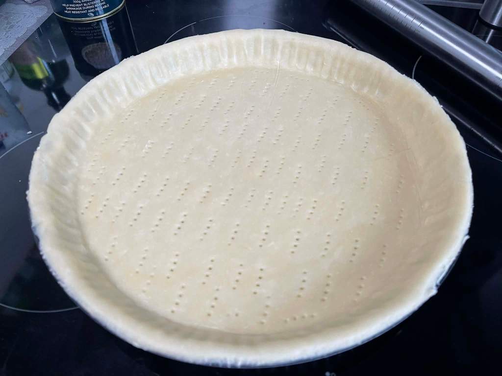 Įkaitinti orkaitę iki 180°C. Iškloti tešla kepimo formą, tešlą subadyti šakute. Prieš dedant įdarą, apkepti tešlą orkaitėje 10 min. 180°C temperatūroje (uždengti kepimo popieriumi ir ant viršaus užberti svorio – pvz., pupelių arba ryžių). Taip pat po to ją galima (bet nebūtina) lengvai patepti plaktu kiaušiniu ir dar 1 min pakepti orkaitėje (taip susidarys „apsauginis sluoksnis“).