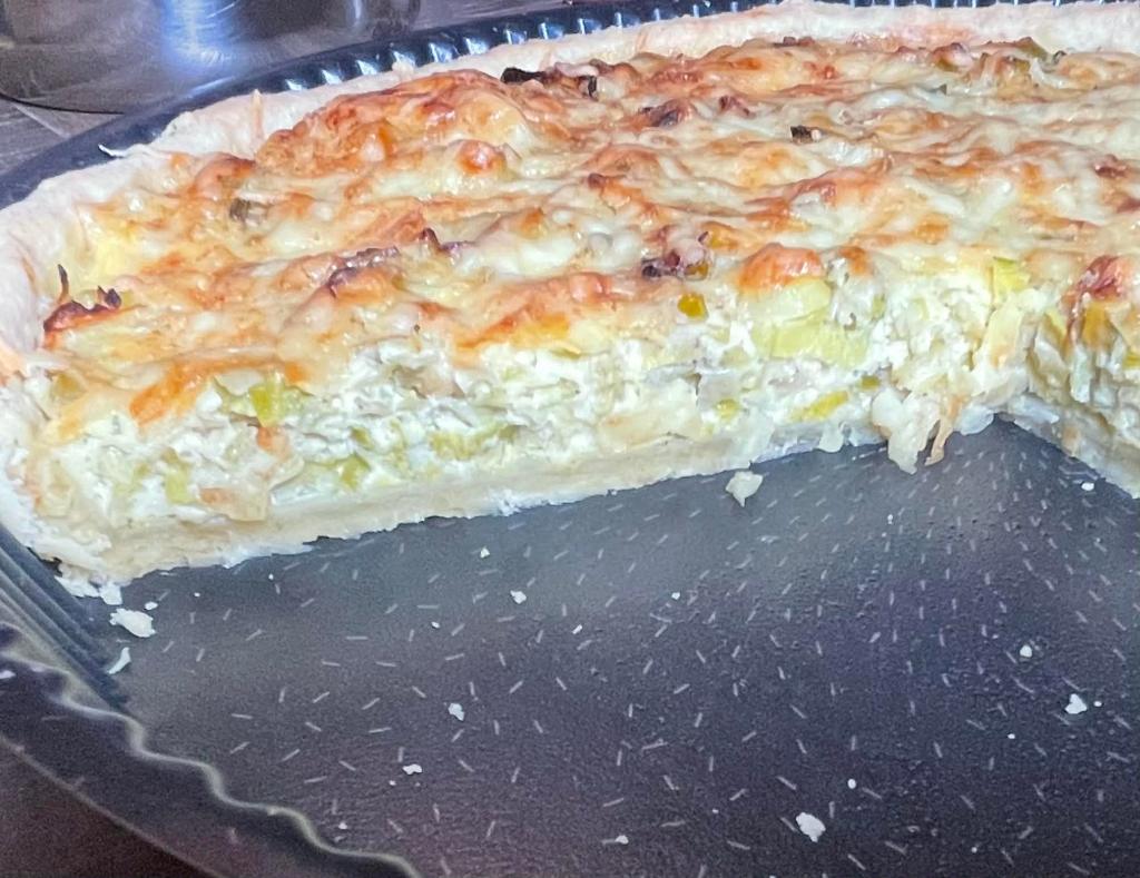 Dubenyje sumaišyti kiaušinius, grietinėlę, druską, pipirus ir kitus prieskonius. Gerai išplakti rankiniu plakikliu. Ant apkepto tešlos pagrindo paskirstyti porus, užpilti kiaušinių plakinį ir apibarstyti tarkuotu sūriu. Kepkite orkaitėje 30 min. 180°C temperatūroje. Prieš pjaustant patiekalą, leisti jam pastovėti 10–15 min.