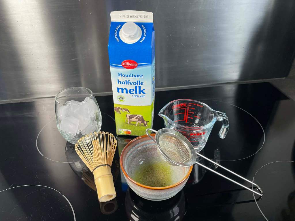 Į dubenėlį persijoti matcha miltelius. Tai labai padeda išvengti gumulėlių. Užpilti apie 60 ml karšto vandens. Plakti bambukine šluotele “W“ arba “M“ judesiais (ne sukant ratu) apie 15-20 sekundžių, kol susidarys lengva puta ir masė taps glotni. Cukrų arba kitą saldiklį (jei naudojamas) įmaišyti į jau išplaktą matchą arba pieną. Į stiklinę sudėti ledo kubelius. Supilti pieną. Ant viršaus lėtai užpilti matchą.